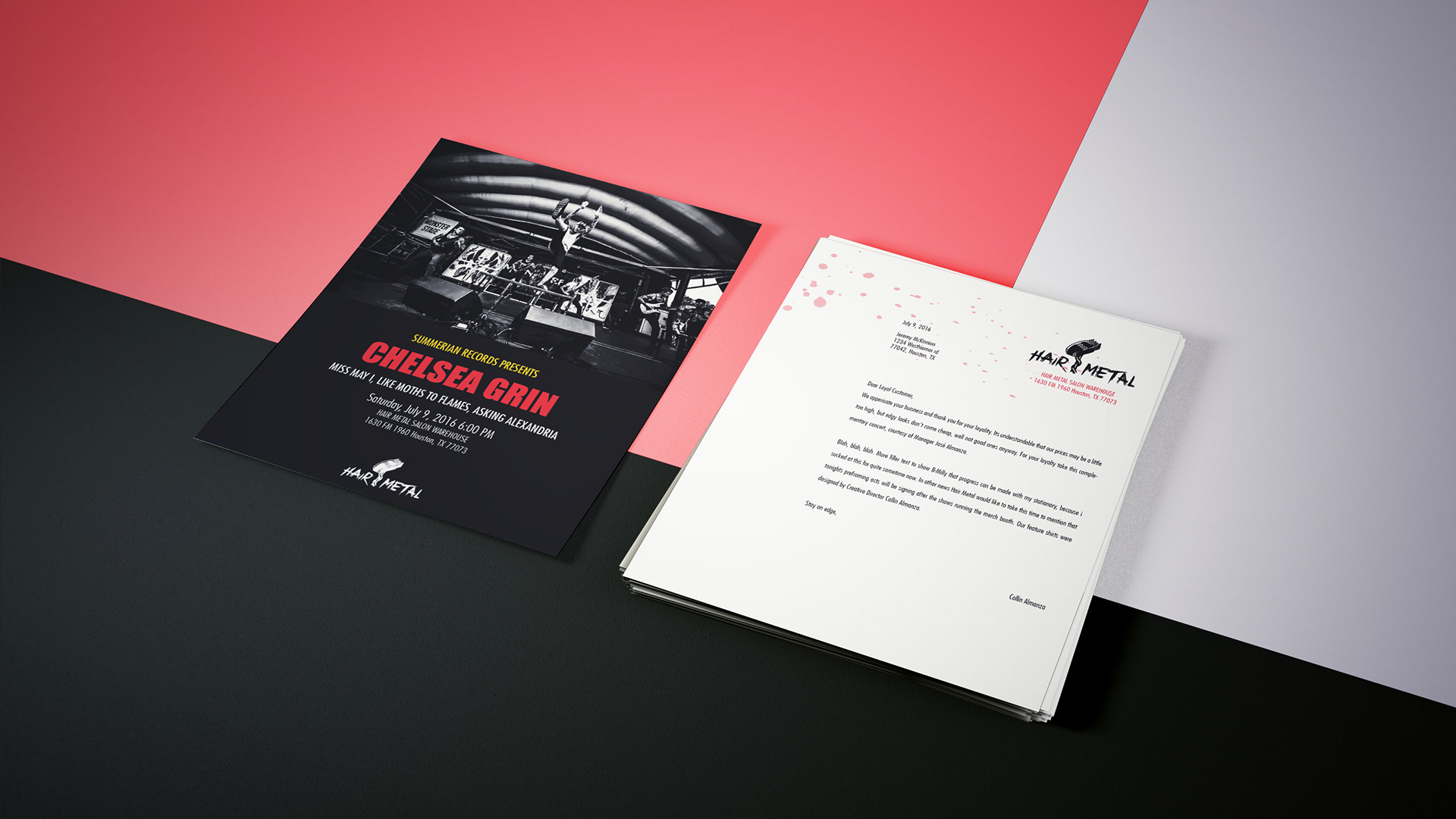 Hair Metal is a collateral design project for a hair salon and a concert venue, catering to the fans of hardcore rock. Inspiration for the branding and product design was found in the violent, heavy sound of the music to compliment salon decor.