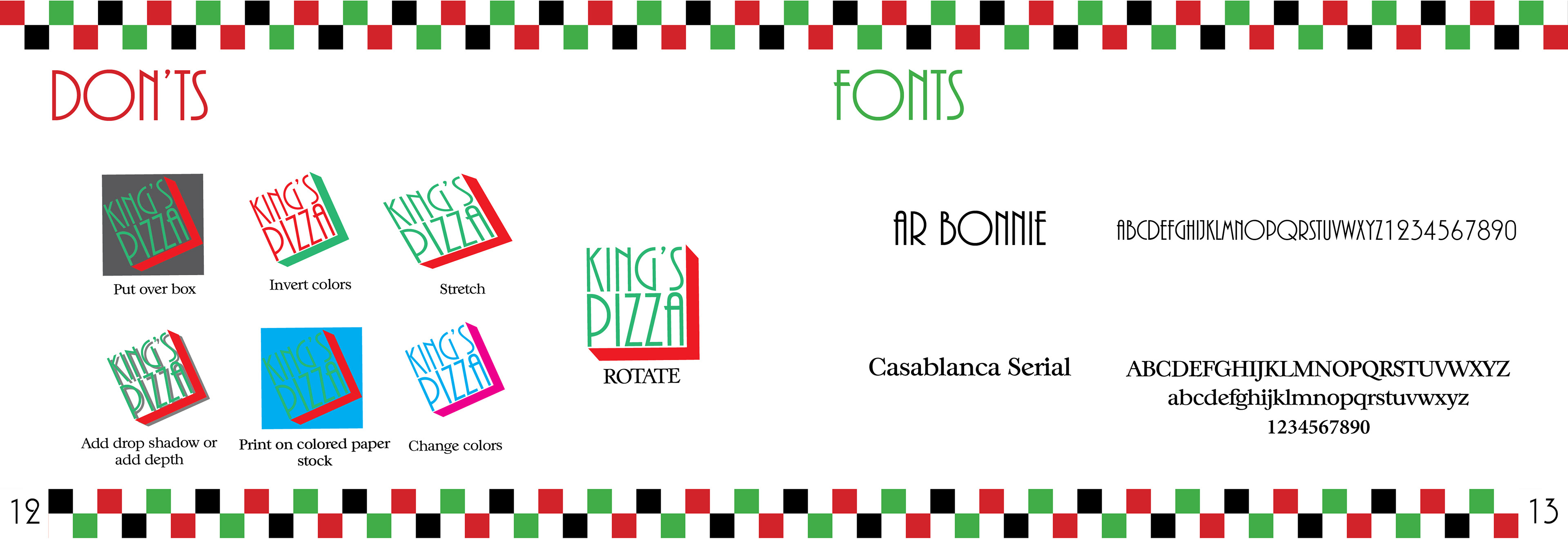 King’s Pizza is a brand identity that ties elements from a classic Italian bistro and an 80’s style arcade to produce a family oriented environment. The pizzeria’s branding is a revamped approach to an iconic style that will appeal to customers young and old.